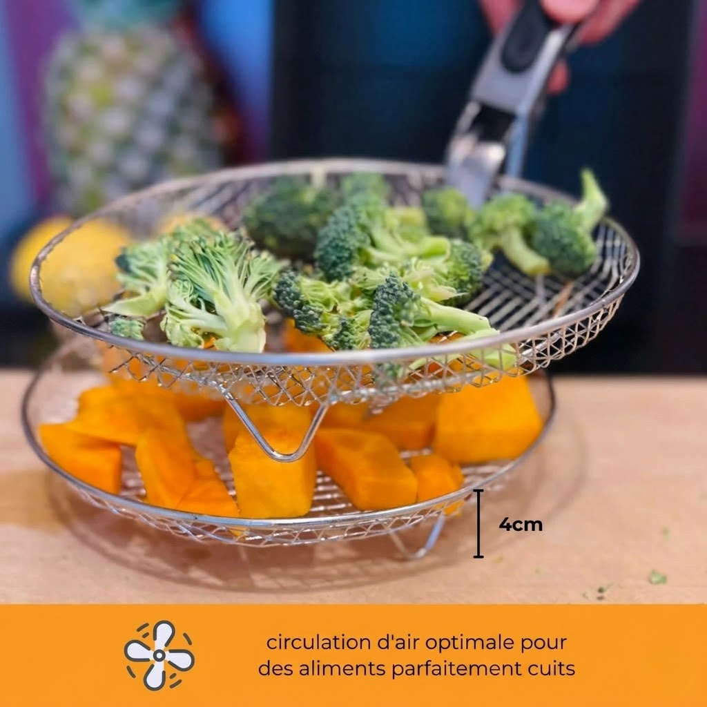 Fatigué de constamment remuer vos aliments pour une cuisson uniforme ? Avec les Grilles de Plaisir pour votre friteuse à air, c'est du passé ! La circulation d'air uniforme fait le travail à votre place. Détendez-vous pendant que vos aliments cuisent parfaitement – sans interruption !